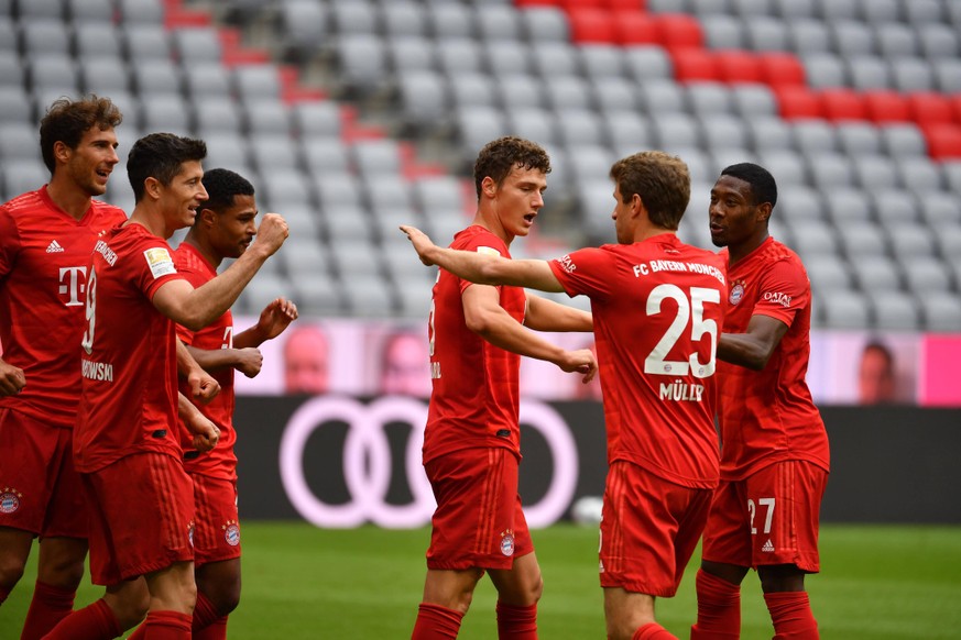 Benjamin pavard of bayern munich celebrates after scoring his team's second goal during the bundesliga match between fc bayern muenchen and fortuna.